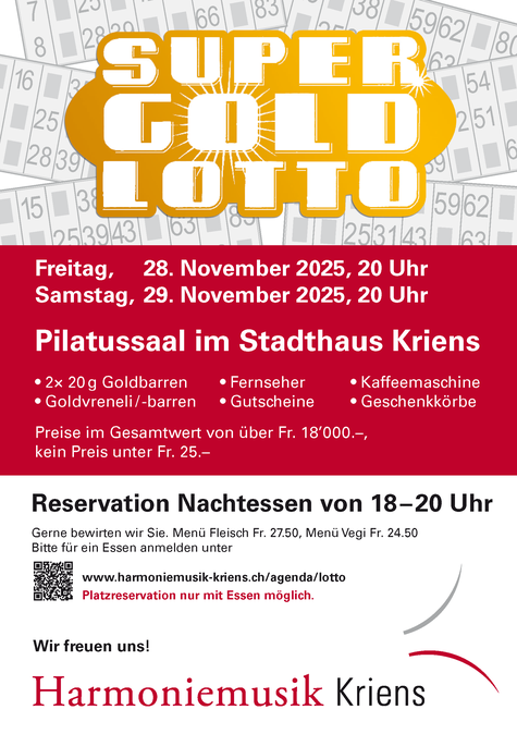 Haben Sie Lust, wieder einmal „Lotto!“ zu rufen und tolle Preise zu gewinnen? Dann freuen wir uns auf Ihren Besuch am 28. und 29. November 2025 im Pilatussaal des Stadthauses Kriens!
